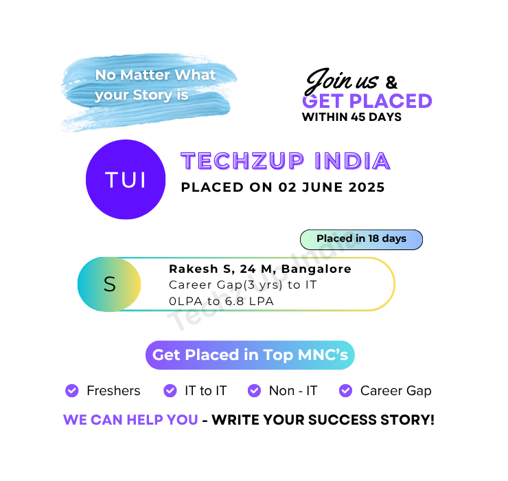 No Matter What Your Story is, We can help you Write our Success Story. We have Helped hundreds of candidates to write their success story. No matter where you are. No matter whether you have a career break or you are from Non IT background or you are a fresher or you want to switch your job even from IT. We got you covered. Get placed in top IT companies in less than 45 days.