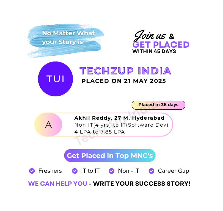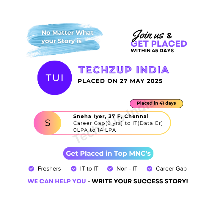 No Matter What Your Story is, We can help you Write our Success Story. We have Helped hundreds of candidates to write their success story. No matter where you are. No matter whether you have a career break or you are from Non IT background or you are a fresher or you want to switch your job even from IT. We got you covered. Get placed in top IT companies in less than 45 days.